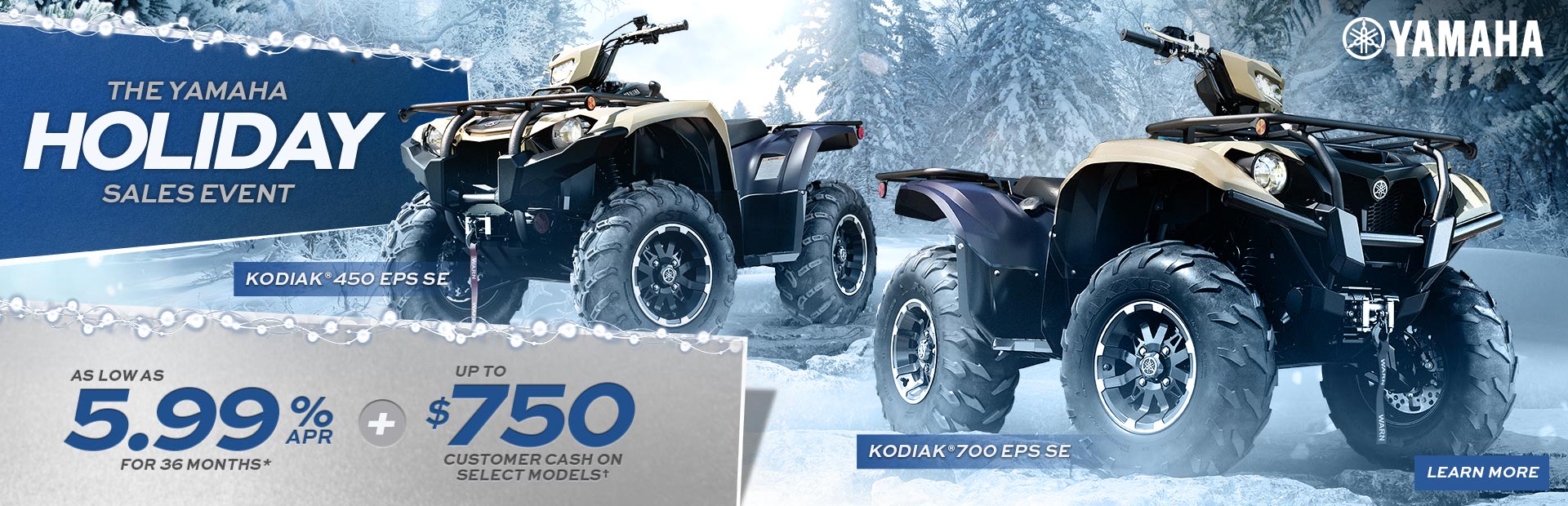 *Offer available on approved purchases of new 2023 – 2026 Yamaha ATVs made on the Yamaha Credit Card issued by WebBank. Offer valid 10/1/2025 – 12/31/2025. Account must be open and current to be eligible for this offer. Promotional 5.99%, 7.99%, 14.49%, 21.99% APR financing with minimum payments of 3.05%, 3.14%, 3.45%, or 3.82% are effective until the purchase is paid in full. Minimum interest charge $2 per month. Promotional rates are based on creditworthiness. Not all applicants will qualify.
