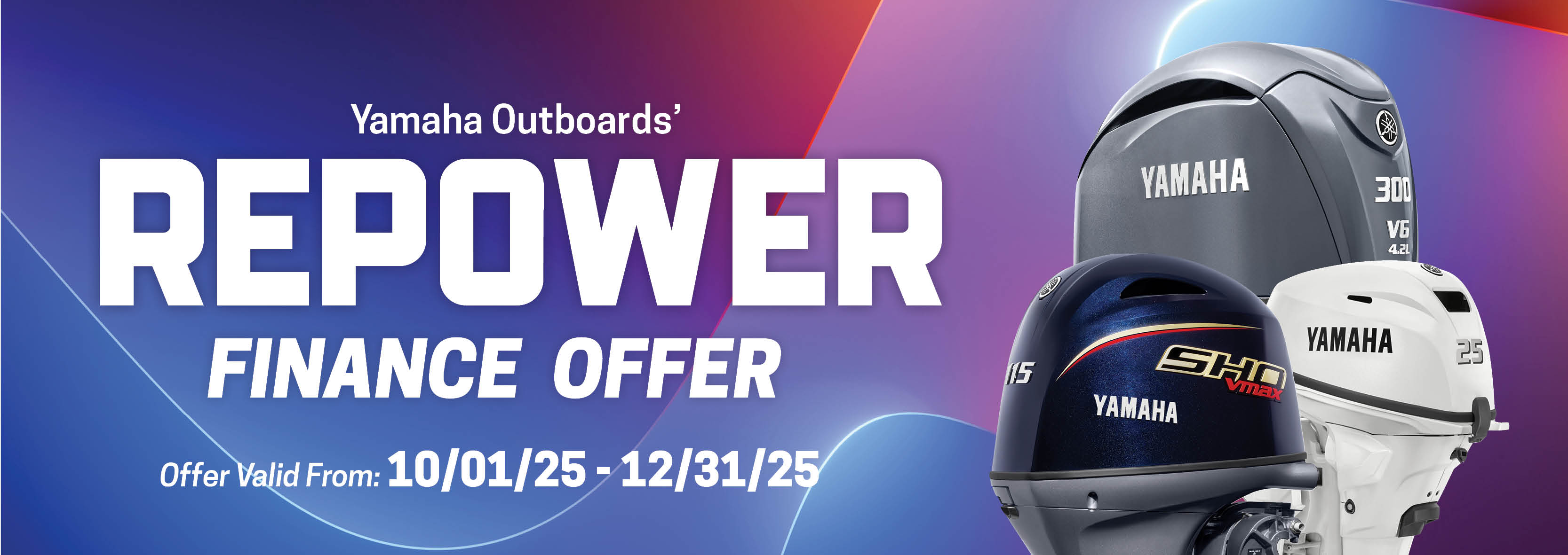 PROGRAM TERMS AND CONDITIONS: Available on approved purchases of new (unused and not previously warranty registered) V6 4.2L 225/250/300HP: DEC Non-Integrated Steering Yamaha outboard motors only (does not include V Max SHO V6 4.2L outboard motors) manufactured since January 2019 made on the Yamaha Credit Card issued by WebBank. Offer valid 10/1/2025 – 12/31/2025. Account must be open and current to be eligible for this offer. Introductory 0% APR for tier 1 - 3 financing with minimum payments of 1.00% of the purchase price balance are effective for initial 12 months based on creditworthiness. After the 12-month introductory period, standard APR 15.99%, 18.99%, 20.99% with minimum monthly payments shall be due equal to the greater of 1% of existing balance plus standard interest charges based on creditworthiness, late fees and late payment amounts, or $25 until the purchase price is paid in full. Minimum interest charge $2 per month. Promotional rates are based on creditworthiness. Not all applicants will qualify.