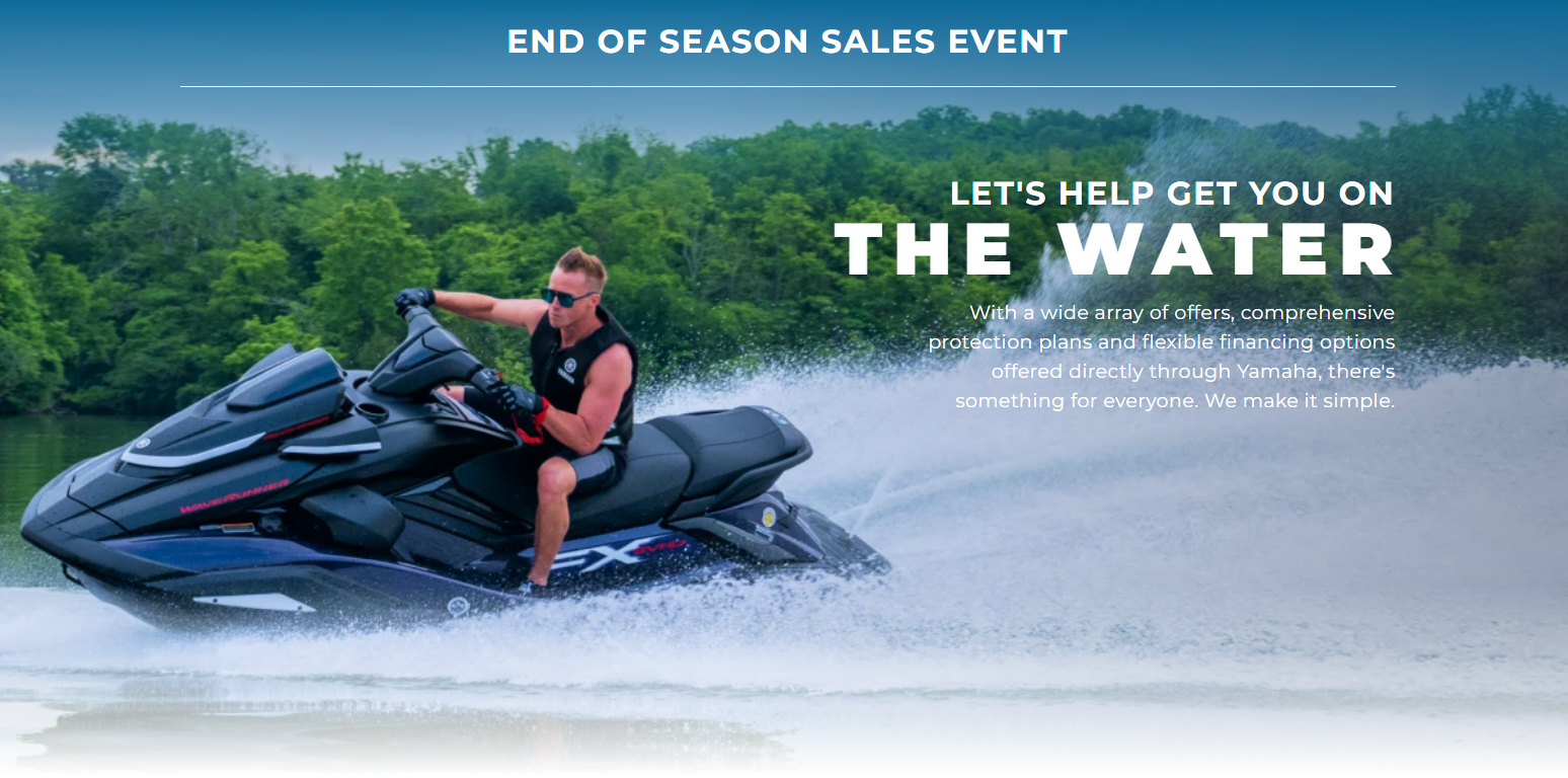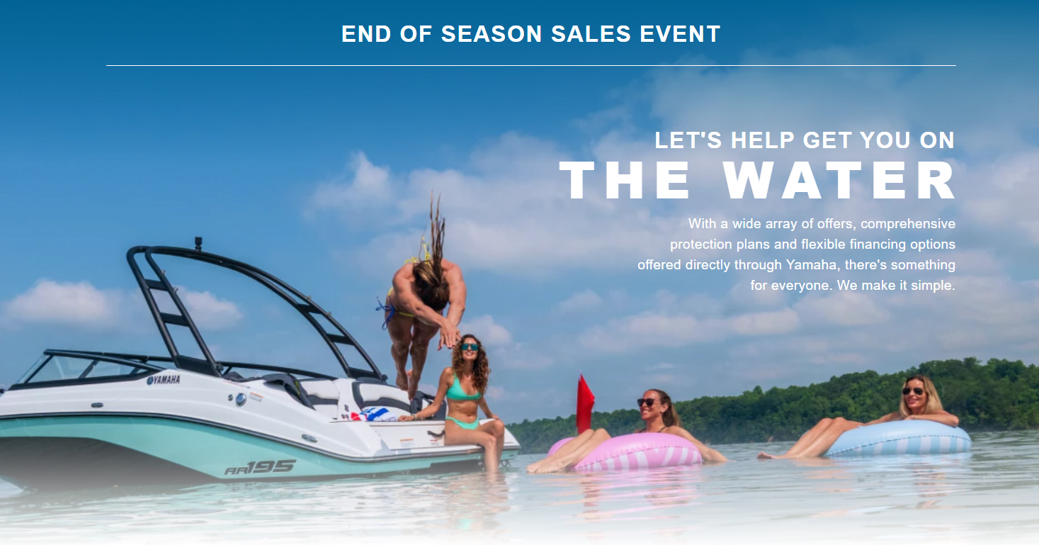 PROGRAM TERMS AND CONDITIONS: *INSTALLMENT OFFER: Available for well qualified, tier 1 credit customers who finance through Yamaha Motor Finance Corporation, U.S.A. Offer valid 10/1/2025 – 12/31/2025. 4.99% APR financing for 72 months at $16.10 per month per $1,000 financed based on pricing of 100% LTV. Must take delivery from retail stock by 12/31/2025 on purchases of new (unused and not previously warranty registered) Yamaha Outboard Motor manufactured since January 2019. Available on approved credit through Yamaha Financial Services. Promotional rates are based on creditworthiness. Not all buyers will qualify. Higher financing rates apply for buyers with lower credit ratings. **CARD OFFER: Available on approved purchases of new (unused and not previously warranty registered) Yamaha Outboard Motor manufactured since January 2019 made on the Yamaha Credit Card issued by WebBank. Offer valid 10/1/2025 – 12/31/2025. Account must be open and current to be eligible for this offer. Introductory 2.99%, 4.99%, 7.49%, 14.49% APR financing with minimum payments of 1.35%, 1.43%, 1.63%, 2.22% of the purchase price balance are effective for initial 36 months based on creditworthiness. After the 36-month introductory period, standard APR 15.99%, 18.99%, 20.99%, 23.99% with minimum monthly payments shall be due equal to the greater of 1% of existing balance plus standard interest charges based on creditworthiness, late fees and late payment amounts, or $25 until the purchase price is paid in full. Minimum interest charge $2 per month. Promotional rates are based on creditworthiness. Not all applicants will qualify.